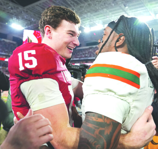 Indiana quarterback Fernando Mendoza, left, embraces Miami running back Mark Fletcher Jr. after the Hoosiers defeated the Hurricanes in the College Football Playoff national championship game on Monday in Miami Gardens, Fla. (AP photo)