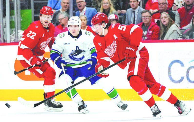 Red Wings defenseman Moritz Seider, right, moves the puck past teammate Mason Appleton, left, and Vancouver Canucks center Aatu Raty during the third period Thursday in Detroit. (AP photo)