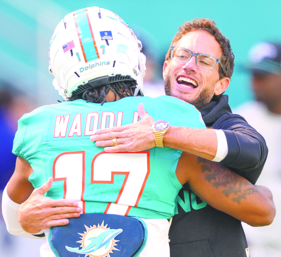 Miami Dolphins head coach Mike McDaniel hugs wide receiver Jaylen Waddle on the field before a game against the Tampa Bay Buccaneers on Dec. 28 in Miami Gardens, Fla. (AP photo)