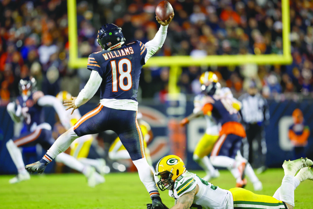 Chicago Bears quarterback Caleb Williams (18) throws on a fourth down play during an wild-card football game against the Green Bay Packers on Saturday in Chicago. (AP photo)