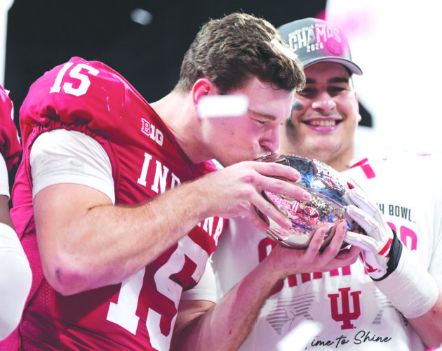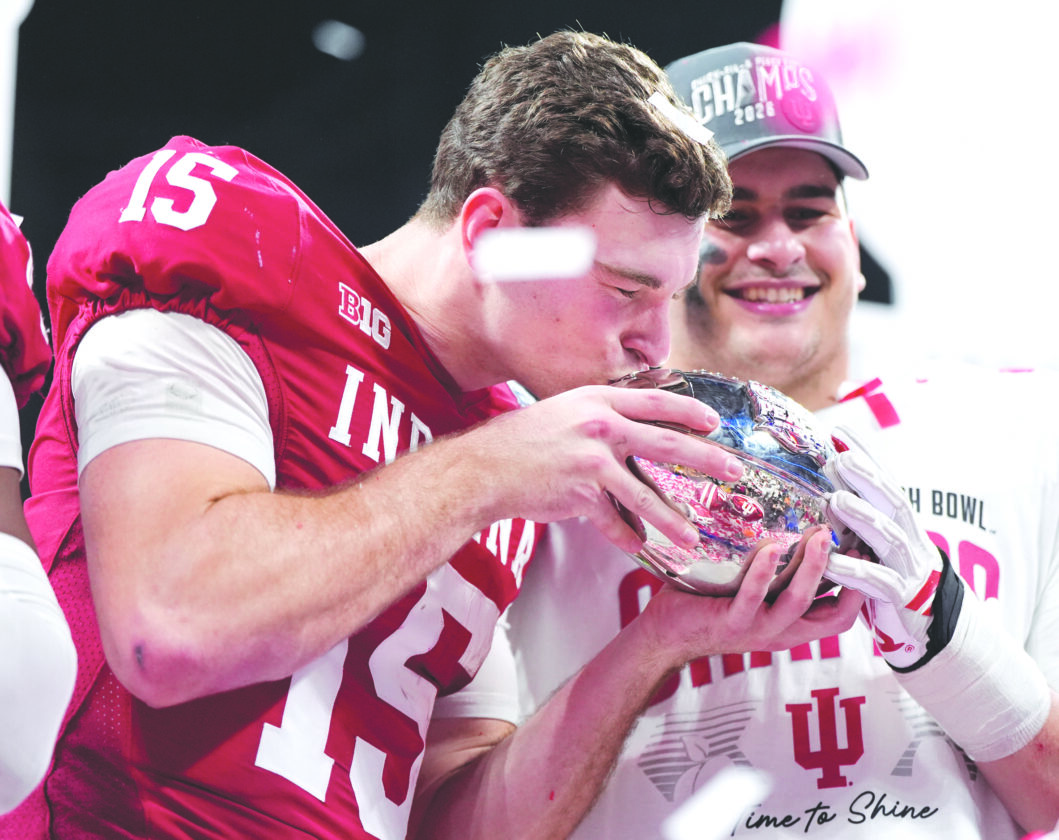 Indiana quarterback Fernando Mendoza, left, kisses the trophy after the Hoosiers won the Peach Bowl CFP semifinal against Oregon on Jan. 9 in Atlanta. (AP photo)