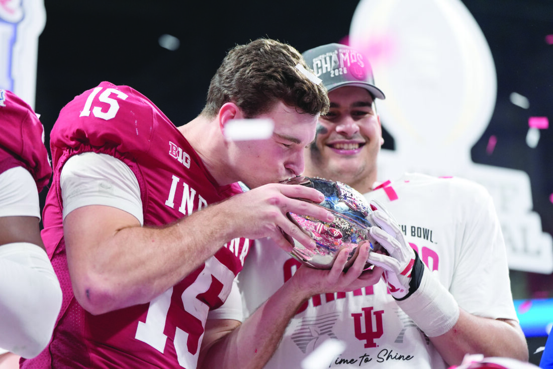 - Indiana quarterback Fernando Mendoza (15) kisses the trophy after the Peach Bowl NCAA college football playoff semifinal against Oregon on Friday in Atlanta. (AP photo)