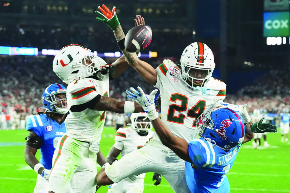 - Miami safety Zechariah Poyser (7) and defensive back Ethan O’Connor (24) break up a pass intended for Mississippi wide receiver De’zhaun Stribling (1) during the second half the Fiesta Bowl NCAA college football playoff semifinal game on Thursday in Glendale, Ariz. (AP photo)