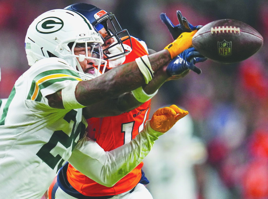 The Green Bay Packers' Xavier McKinney, front, breaks up a pass intended for the Broncos' Courtland Sutton during the second half on Dec. 14 in Denver. (AP file photo)