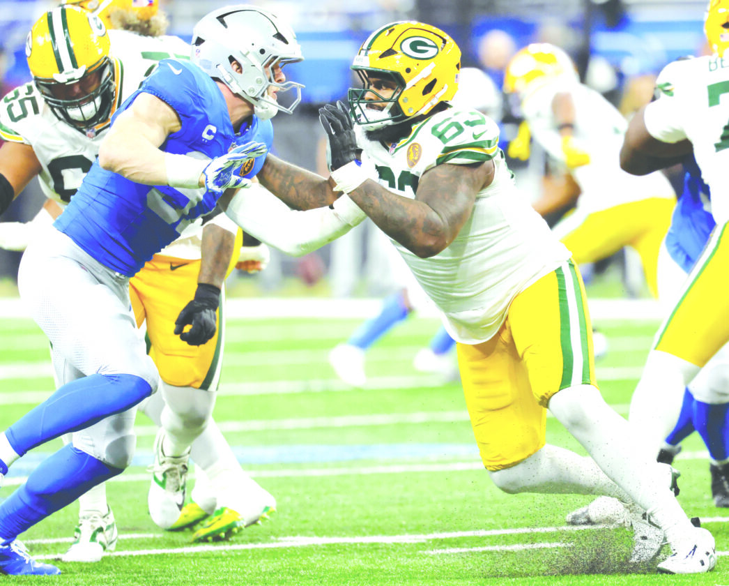 Green Bay Packers offensive tackle Rasheed Walker, right, blocks Lions defensive end Aidan Hutchinson in Detroit on Nov. 27. (AP file photo)