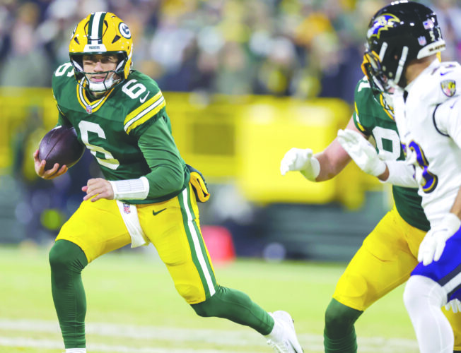 Packers quarterback Clayton Tune, left, rushes against the Baltimore Ravens last Saturday in Green Bay, Wis. (AP photo)