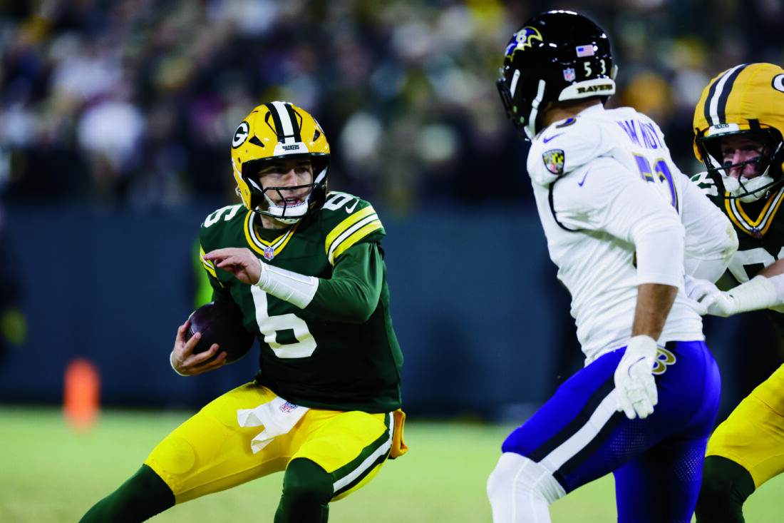 Green Bay Packers quarterback Clayton Tune (6) rushes the ball against the Baltimore Ravens during the second half of an NFL football game, on Saturday in Green Bay, Wis. (AP photo)