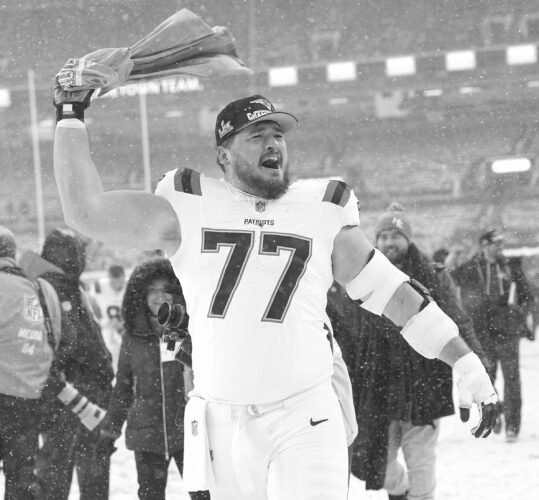 New England Patriots guard Ben Brown celebrates after his team's win over the Broncos in the AFC Championship playoff game on Sunday in Denver. (AP photo)