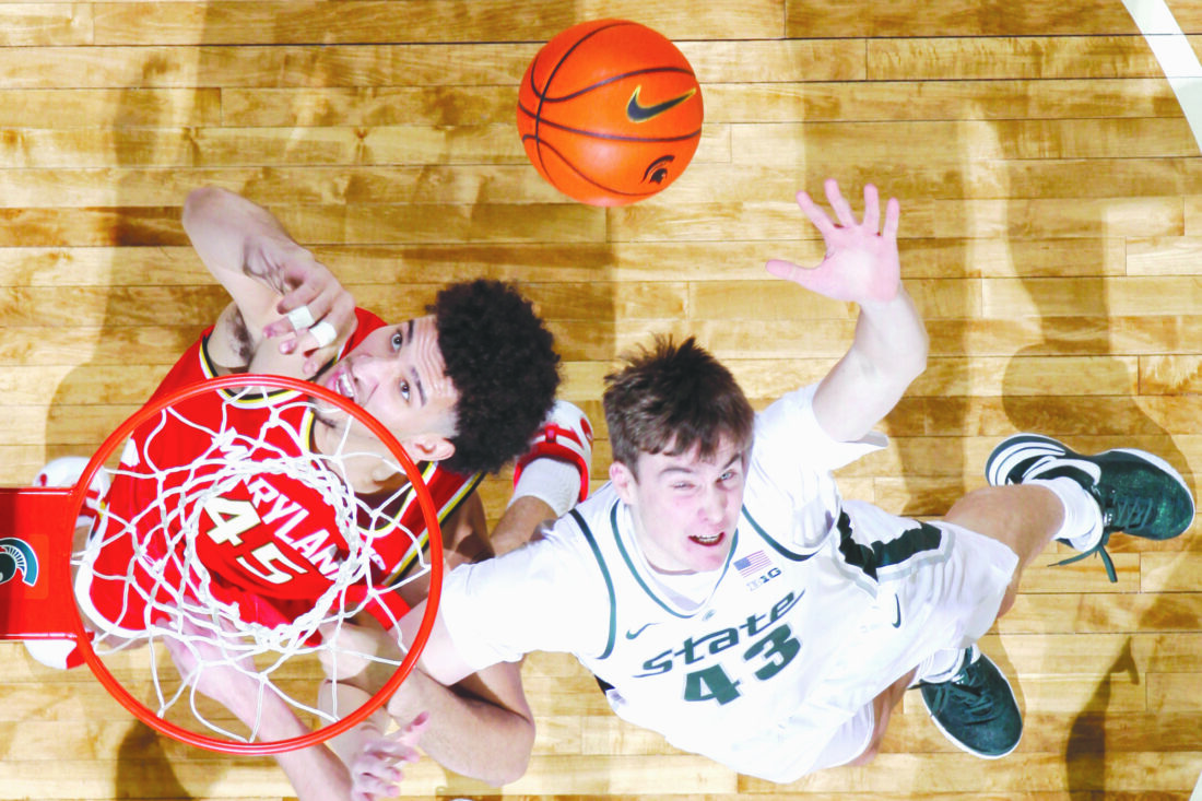 Maryland center Collin Metcalf, left, and Michigan State forward Colin Walton vie for a rebound on Saturday in East Lansing. (AP photo)