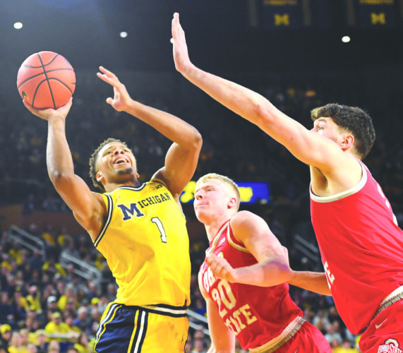 From left, Michigan guard Trey McKenney puts up a shot as he is defended by Ohio State forward Colin White and center Ivan Njegovan during the second half on Friday in Ann Arbor. (AP photo)