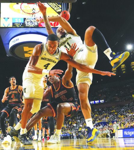 Michigan guards Nimari Burnett, left front, and Roddy Gayle Jr., right, vie for the ball against Southern California forward Ezra Ausar , between them at bottom, during the second half on Friday in Ann Arbor. (AP photo)