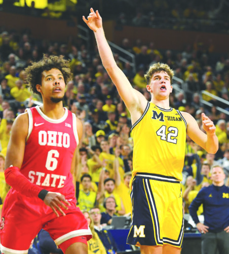Michigan forward Will Tschetter, right, watches his shot attempt as he is guarded by Ohio State forward Puff Johnson during the second half on Friday in Ann Arbor. (AP photo)
