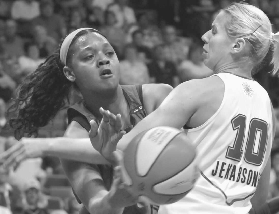 The Detroit Shock's Kara Braxton, left, passes around the Connecticut Sun's Anete Jekabsone-Zogota during the first half of a WNBA game in Uncasville, Conn., on July 11, 2009. (AP file photo)