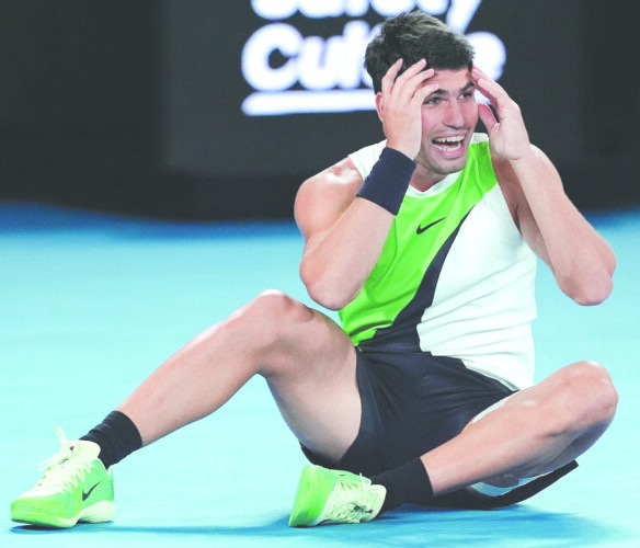 Carlos Alcaraz celebrates after defeating Novak Djokovic in the men's singles final at the Australian Open tennis championship in Melbourne, Australia, on Sunday. (AP photo)