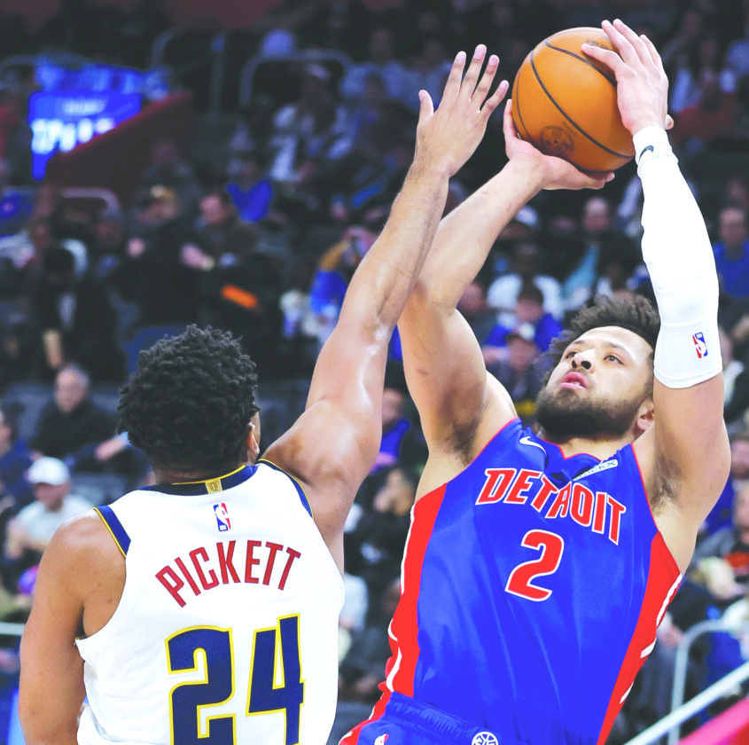 Pistons guard Cade Cunningham, right, takes a shot against Denver Nuggets guard Jalen Pickett during the first half on Tuesday in Detroit. (AP photo)