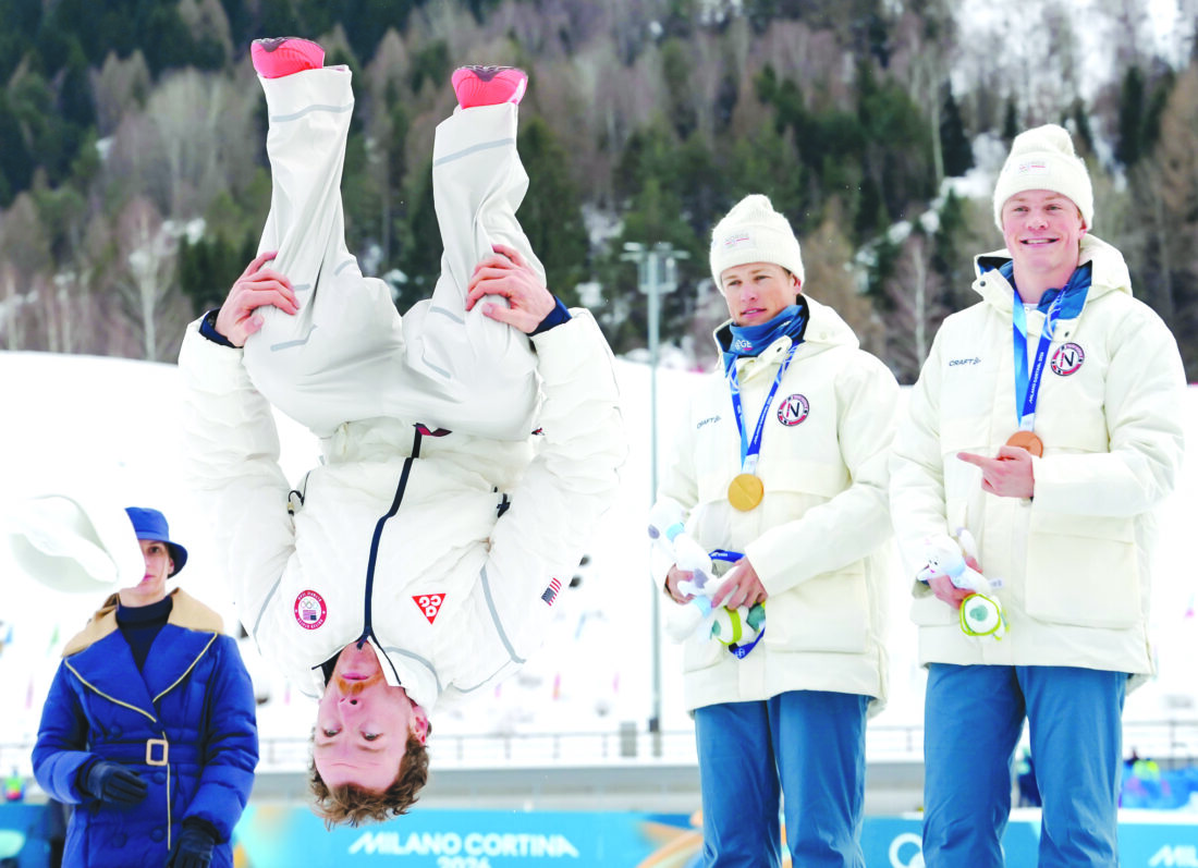 Silver medalist Ben Ogden of the United States does a back flip from the podium while gold medalist Johannes Hoesflot Klaebo of Norway and bronze medalist Oskar Opstad Vike, also of Norway, right, look on after the cross-country skiing men's sprint classic at the 2026 Winter Olympics in Tesero, Italy, on Tuesday. (AP photo)