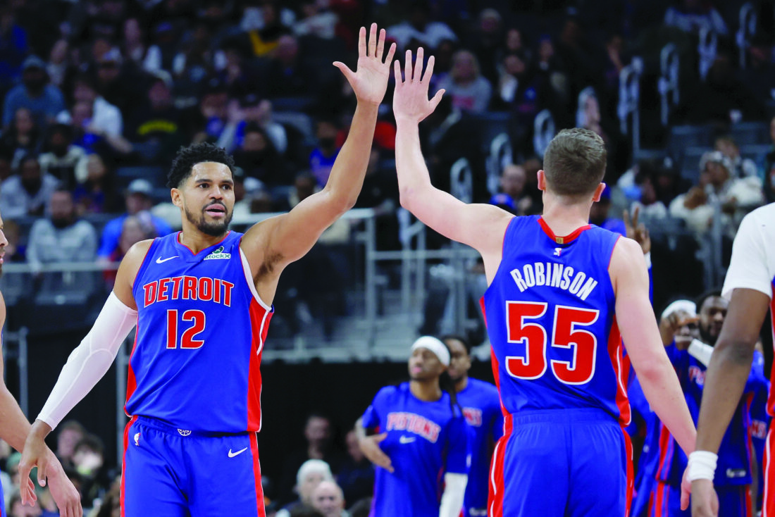 Detroit Pistons forward Tobias Harris (12) celebrates with forward Duncan Robinson (55) during the second half of an NBA basketball game against the Sacramento Kings on Jan. 25 in Detroit. (AP photo)