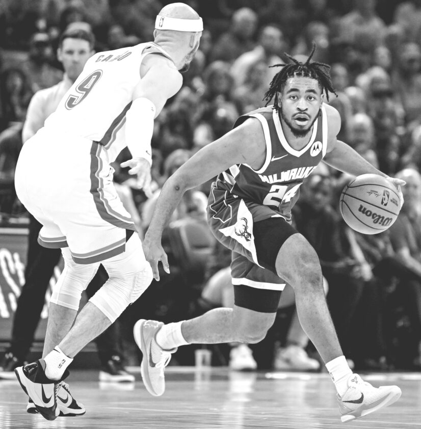 Milwaukee Bucks guard Cam Thomas, right, drives against Thunder guard Alex Caruso during the first half on Thursday in Oklahoma City. (AP photo)