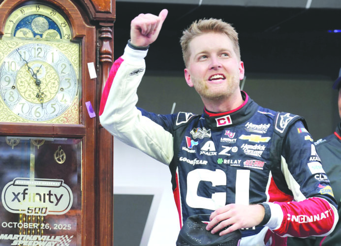 William Byron celebrates in Victory Lane after winning a NASCAR Cup series race in Martinsville, Va., on Oct. 26. (AP file photo)