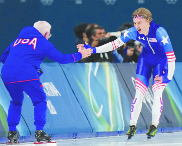 Jordan Stolz of the U.S. celebrates with his coach Bob Corby, left, after the men's 1,000-meter speedskating race at the 2026 Winter Olympics in Milan, Italy, on Wednesday. (AP photo)