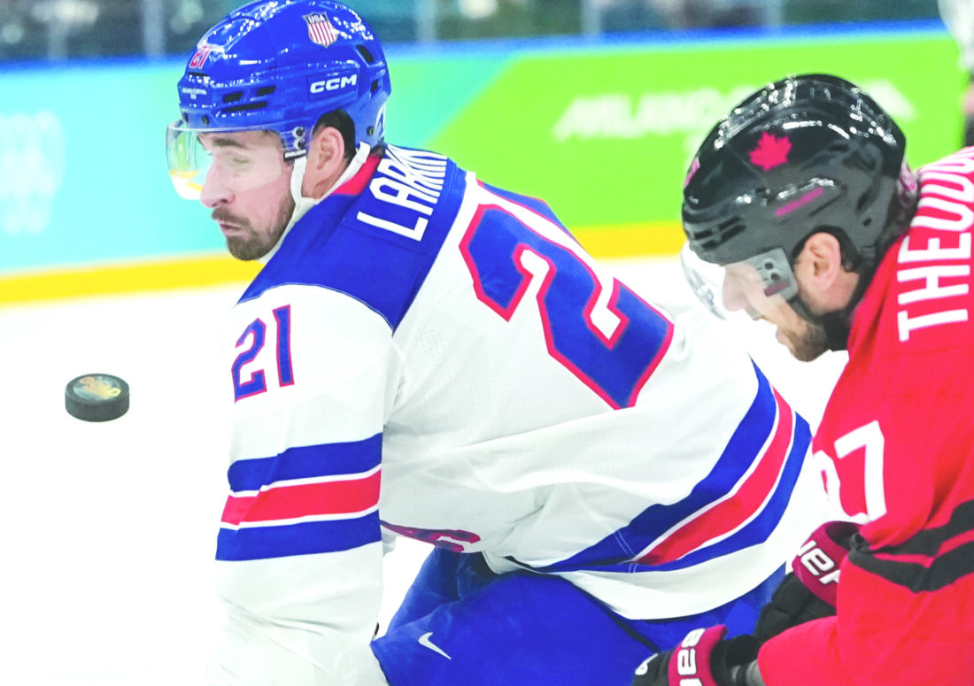 American and Detroit Red Wing Dylan Larkin, left, and Canada's Shea Theodore eye the puck during the men's hockey gold medal game at the 2026 Winter Olympics in Milan, Italy, on Sunday. (AP photo)