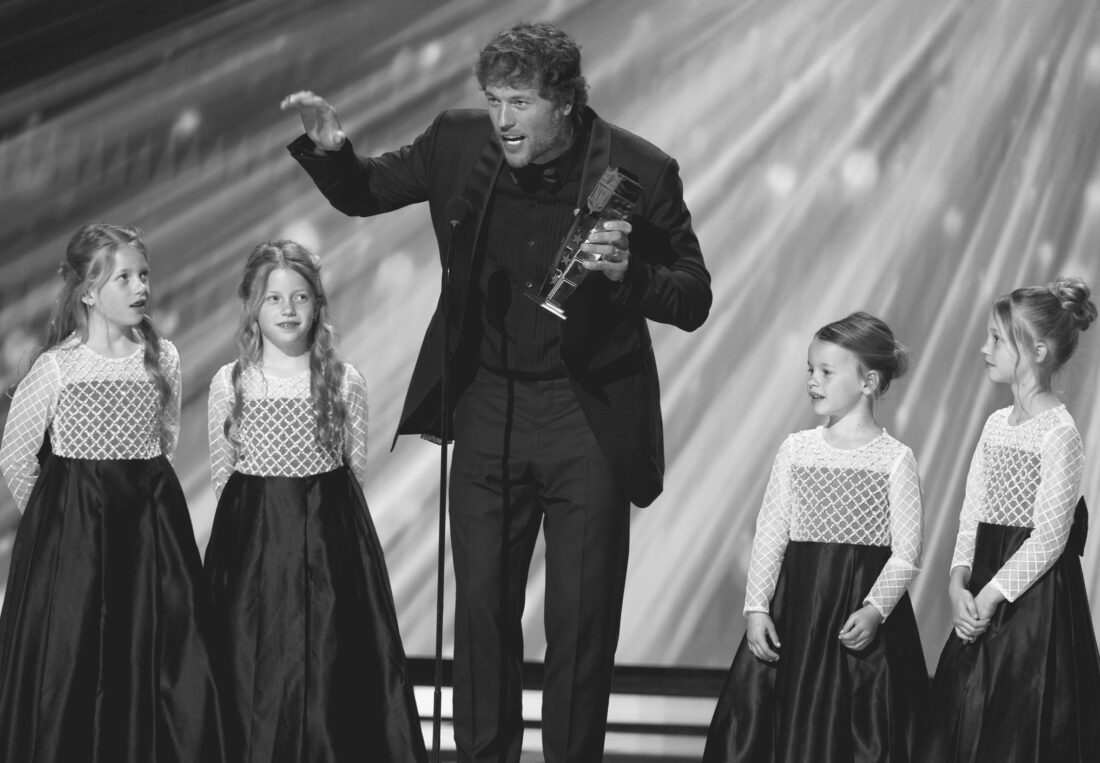 Stafford brought his four daughters — all dressed in identical black-and-white dresses — to the stage to accept the award.