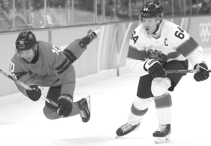 Canada's Nick Suzuki, left, challenges Finland's Mikael Granlund during a men's hockey semifinal game at the 2026 Winter Olympics in Milan, Italy, on Friday. (AP photo)