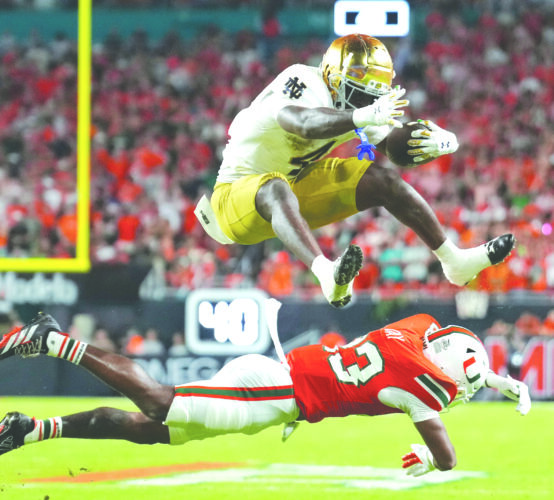 Notre Dame running back Jeremiyah Love, top, leaps over Hurricanes defensive back Dylan Day on Aug. 31 in Miami. (AP file photo)