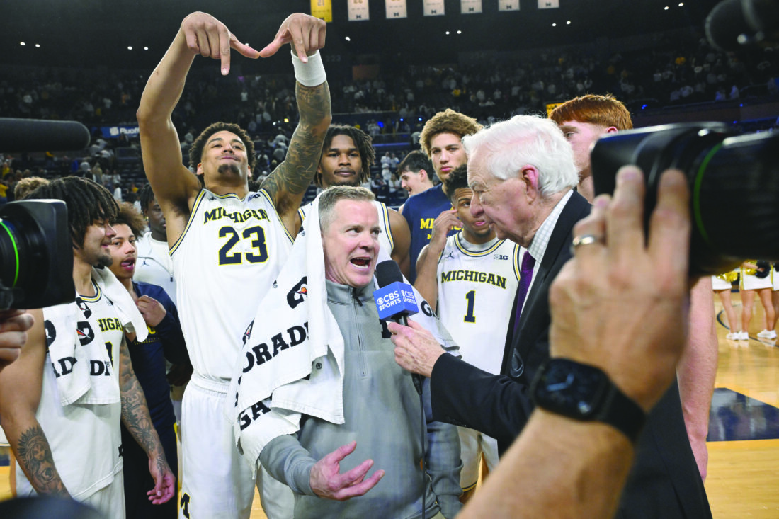 Michigan forward Yaxel Lendeborg (23) smiles as he celebrates with his teammates as head coach Dusty May is interviewed following a win over UCLA in an NCAA college basketball game in Ann Arbor on Saturday. (AP photo)
