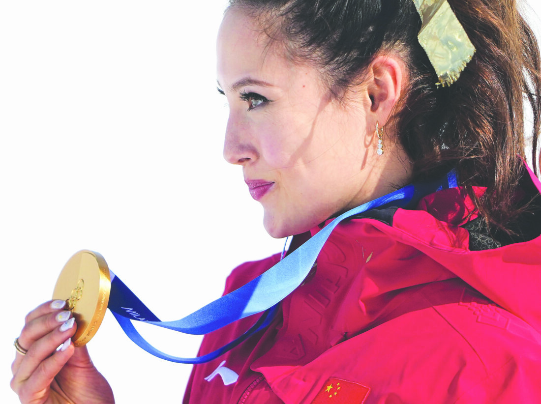 China's Eileen Gu poses with her gold medal after winning the women's freestyle skiing halfpipe final at the 2026 Winter Olympics in Livigno, Italy, on Sunday. (AP photo)