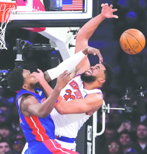 Knicks center Karl-Anthony Towns, right, is blocked by Detroit Pistons forward Paul Reed during the second half on Thursday in New York. (AP photo)