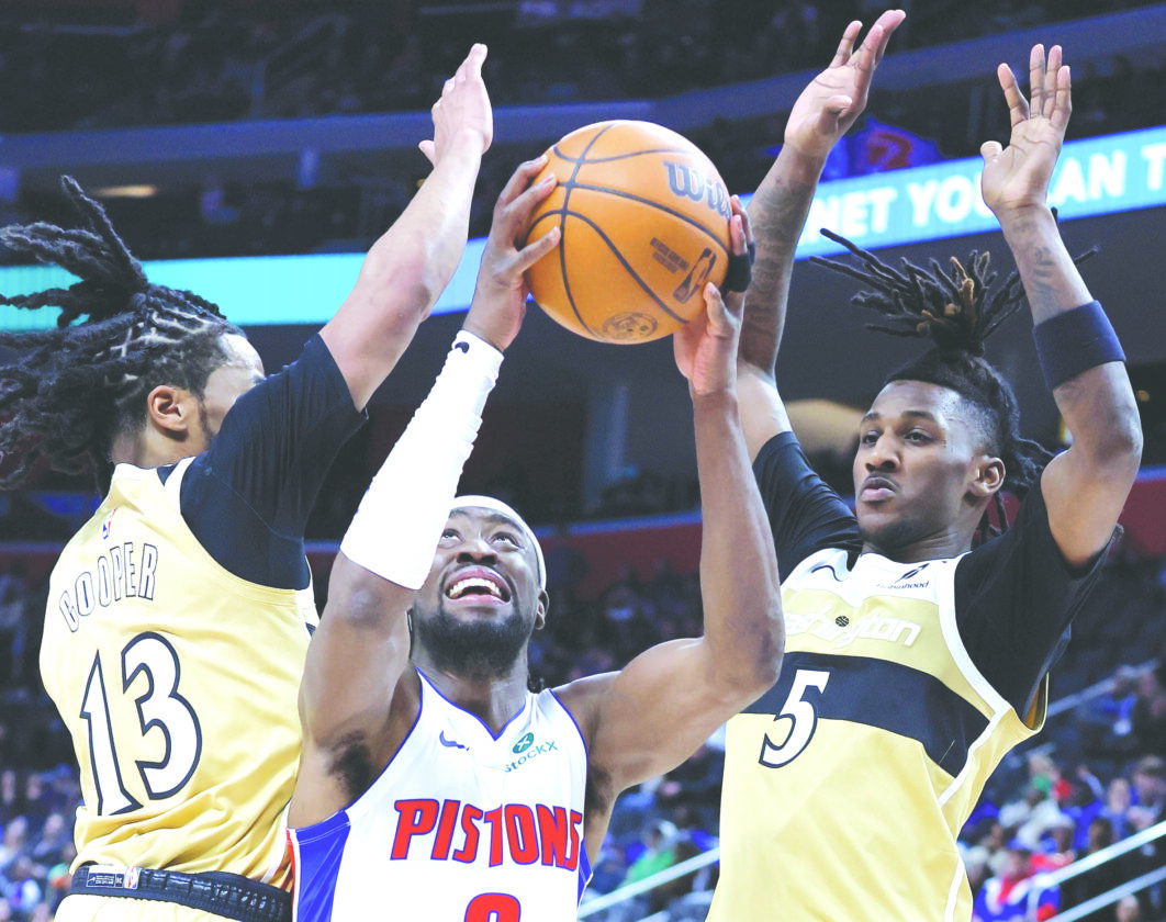 Pistons guard Caris LeVert, center, goes to the basket between Washington Wizards guards Sharife Cooper, left, and Jamir Watkins during the second half on Thursday in Detroit. (AP photo)