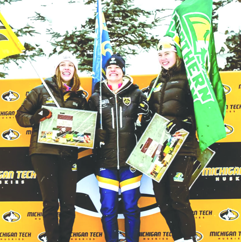 Northern Michigan University’s Lauren McCollor, right, stands in the third-place spot after finishing there in the five-kilometer classic individual start race at the Michigan Tech Invitational college nordic ski meet held in Houghton on Saturday. At left is runner-up Bridget Burns of Michigan Tech and at center is race winner Della Bettendorf of the College of St. Scholastica. (Photo courtesy of NMU)