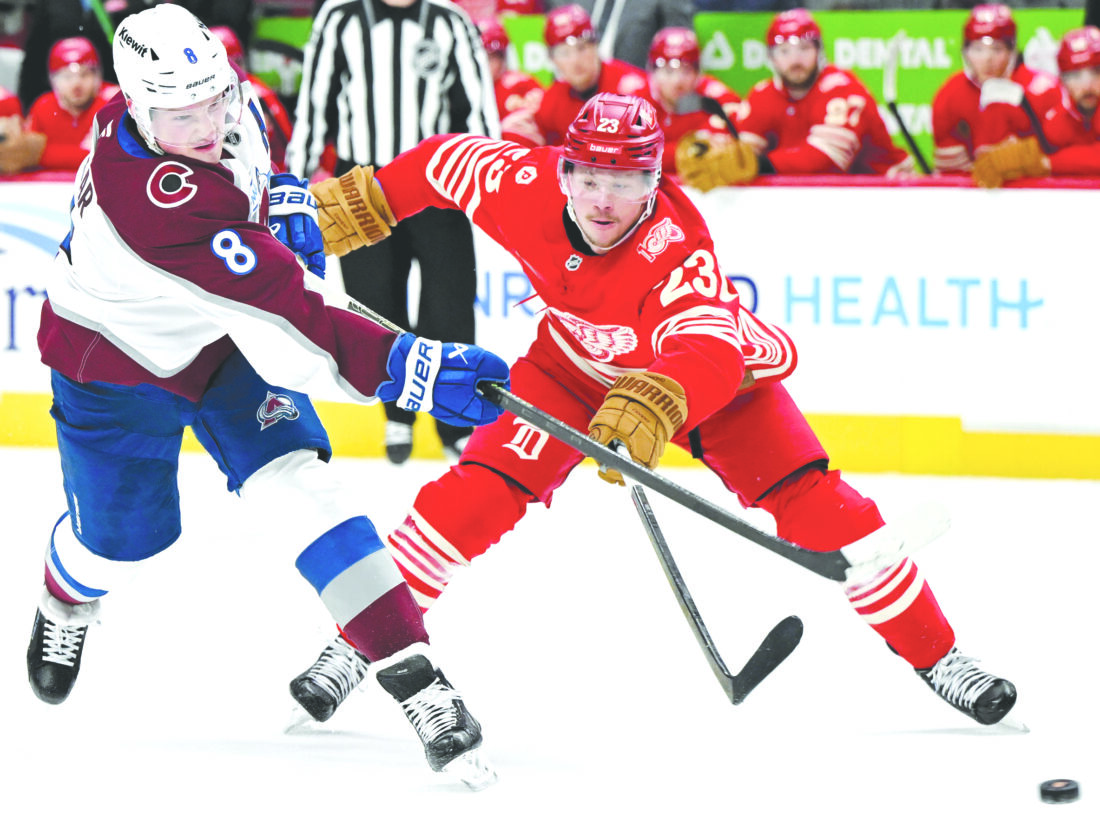 Colorado Avalanche defenseman Cale Makar, left, shoots the puck past Red Wings left wing Lucas Raymond in the first period on Saturday in Detroit. (AP photo)