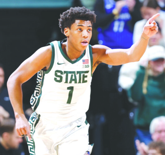 Michigan State guard Jeremy Fears Jr. reacts after hitting a basket during the first half against Illinois on Saturday in East Lansing. (AP photo)