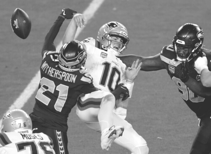 Seattle Seahawks cornerback Devon Witherspoon, left, forces a fumble against New England Patriots quarterback Drake Maye, center, during Super Bowl 60 in Santa Clara, Calif., on Sunday. (AP photo)