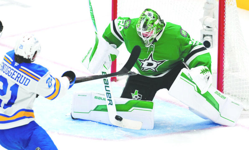 Stars goaltender Jake Oettinger blocks a shot from St. Louis Blues right wing Jimmy Snuggerud in an NHL game on Wednesday in Dallas. (AP photo)