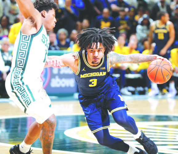 Michigan guard Elliot Cadeau, right, drives against Michigan State guard Jeremy Fears Jr. on Friday in East Lansing. (AP photo)