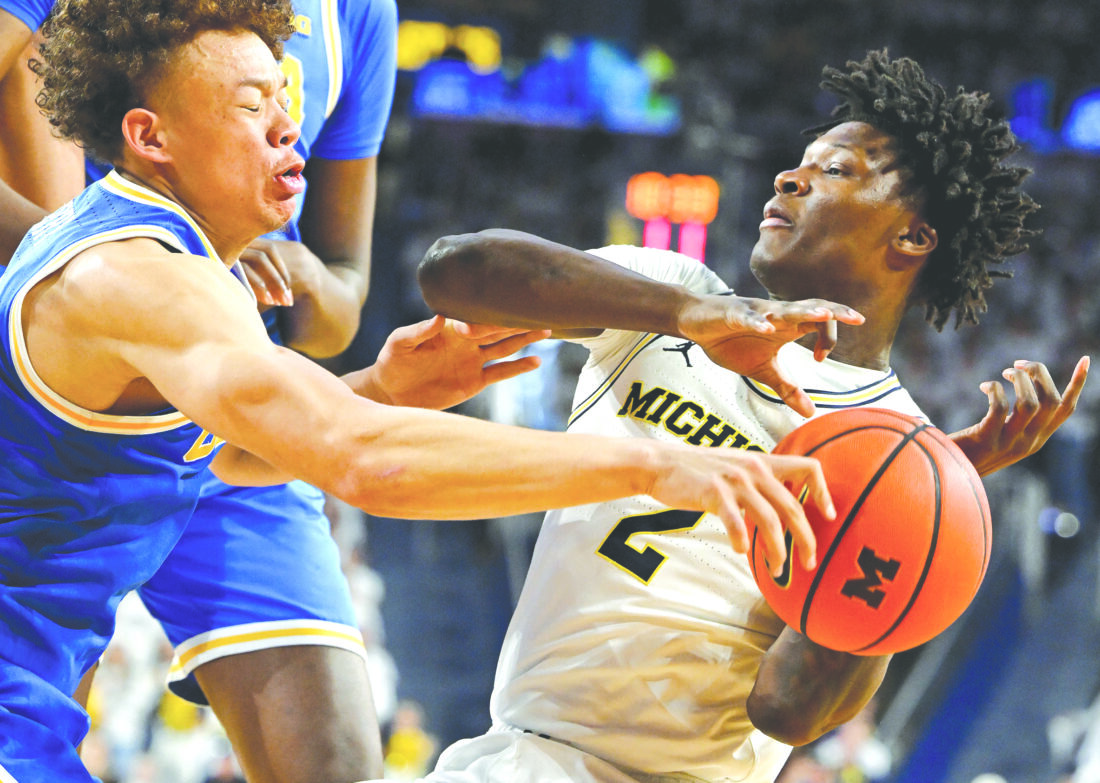 UCLA guard Trent Perry, left, knocks the ball away from Michigan guard L.J. Cason in the second half in Ann Arbor on Saturday. (AP photo)