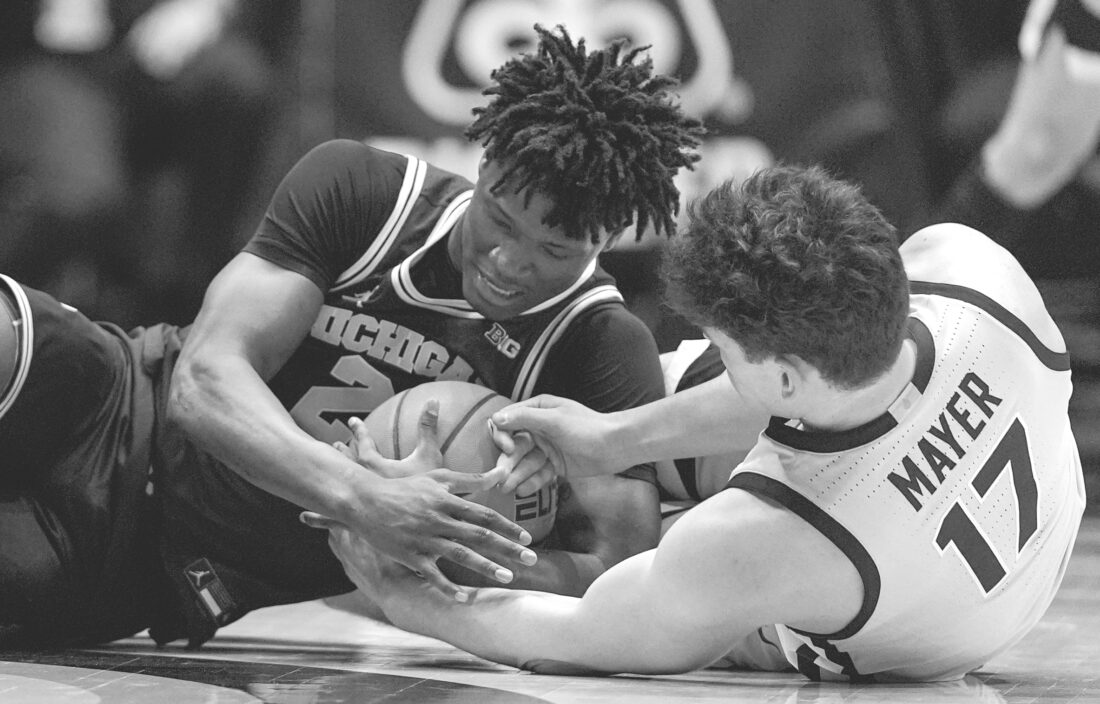 Michigan guard L.J Cason, left, and Purdue guard Omer Mayer go for a loose ball during the second half in West Lafayette, Ind., on Tuesday. (AP photo)