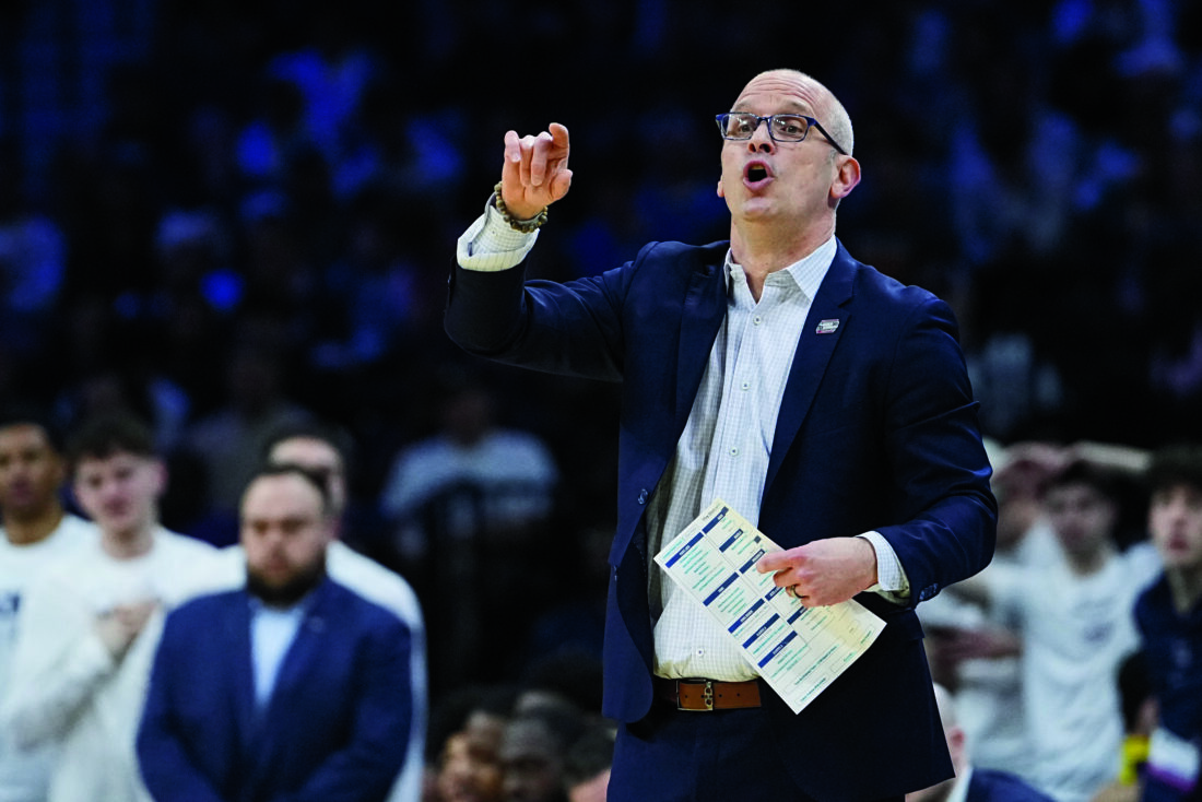 UConn head coach Dan Hurley calls out to his team during the first half in the second round of the NCAA college basketball tournament against UCLA on Sunday in Philadelphia. (AP photo)