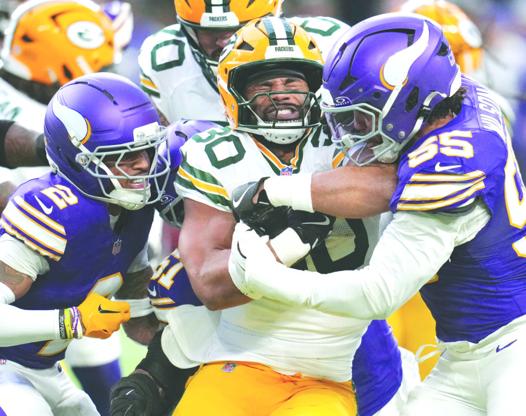 Green Bay Packers running back Chris Brooks, center, is tackled by Minnesota Vikings cornerback Isaiah Rodgers, left, and linebacker Eric Wilson during the first half on Jan. 4 in Minneapolis. (AP file photo)