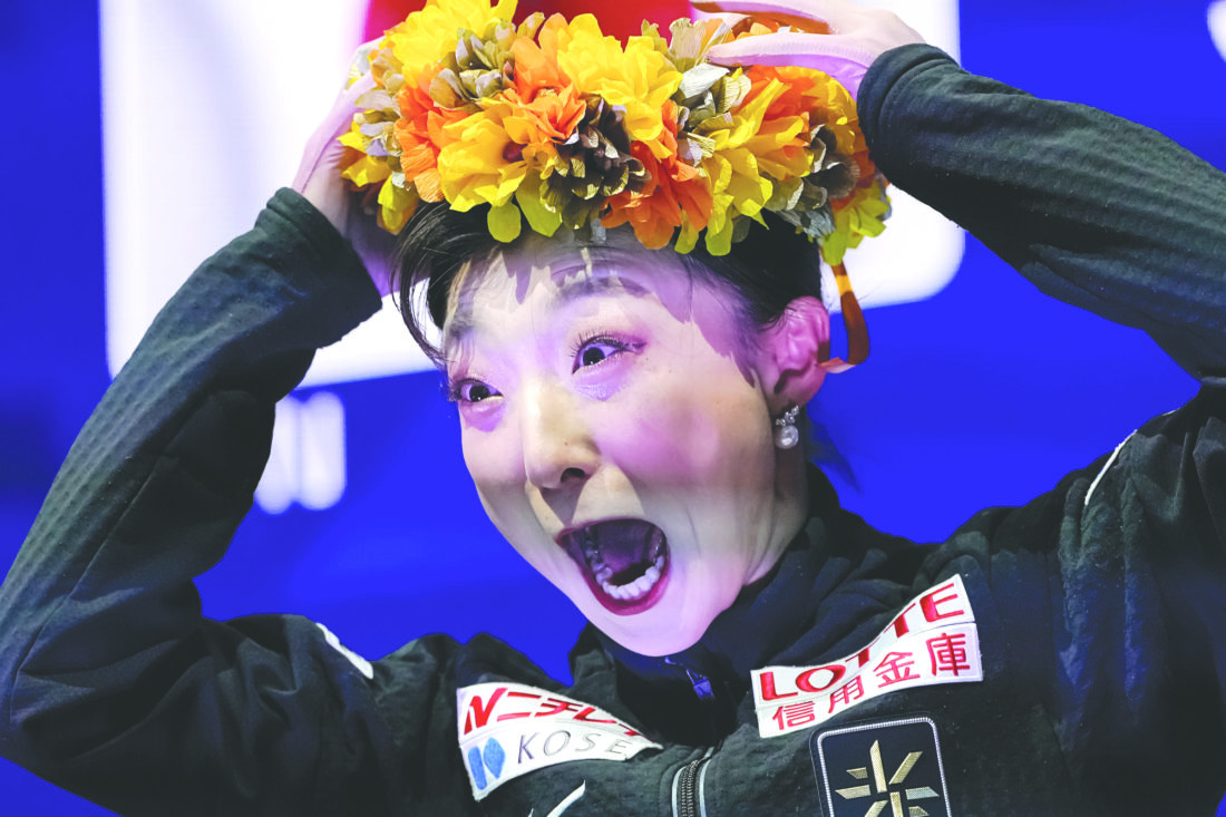Kaori Sakamoto of Japan reacts while waiting for her score during the women free skating at the Figure Skating World Championships in Prague, Czech Republic, on Friday. (AP photo)