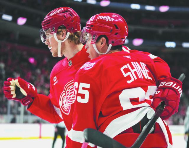 Red Wings right wing Dominik Shine, right, celebrates his goal with teammate Simon Edvinsson against the Ottawa Senators in the second period on Tuesday in Detroit. Shine, a star at Northern Michigan University from 2013-17, scored his third NHL goal. (AP photo)