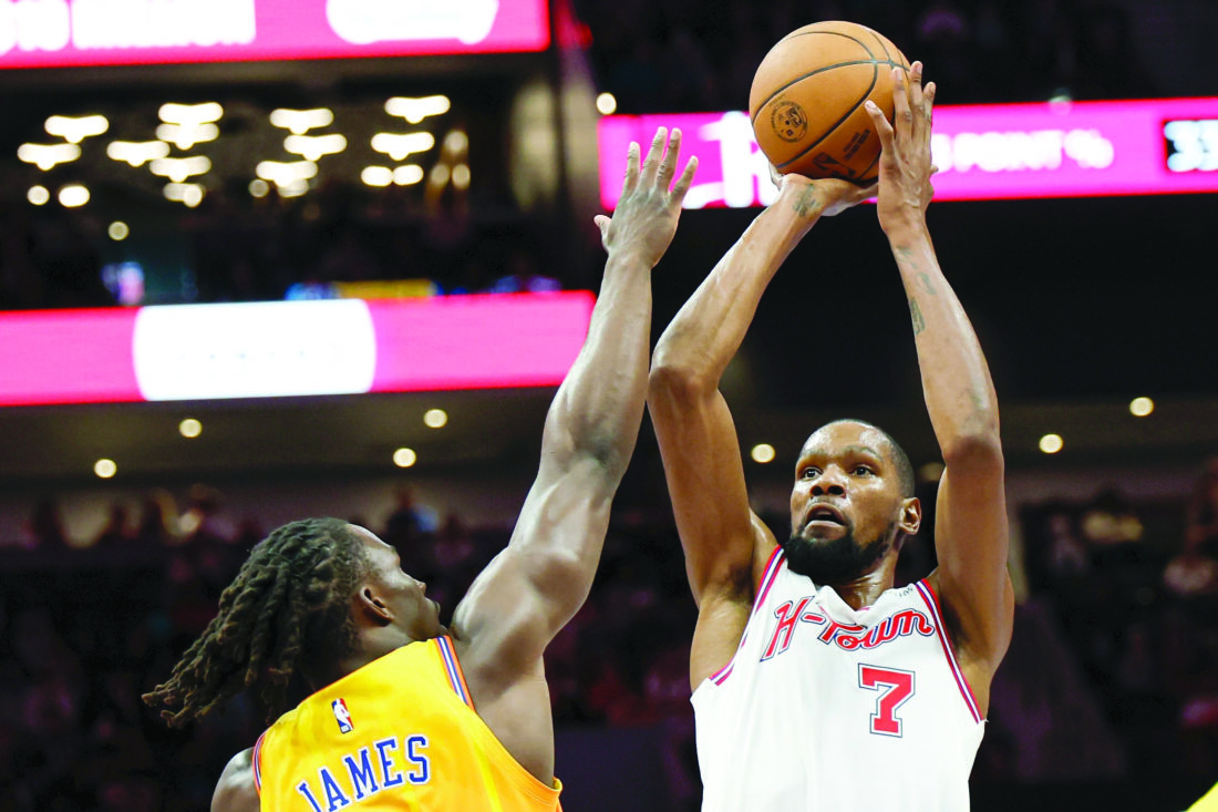 Houston Rockets forward Kevin Durant (7) looks to shoot against Charlotte Hornets guard Sion James, left, during the first half of an NBA basketball game in Charlotte, N.C., on Feb. 19. (AP photo)