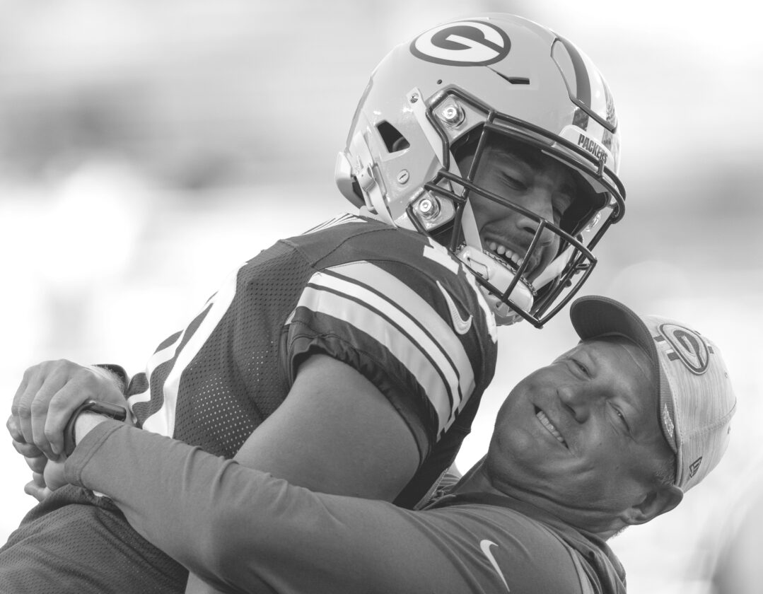 Packers' quarterback coach Luke Getsy hugs quarterback Jordan Love before a preseason game against the Houston Texans on Aug.14, 2021, in Green Bay, Wis. (AP file photo)