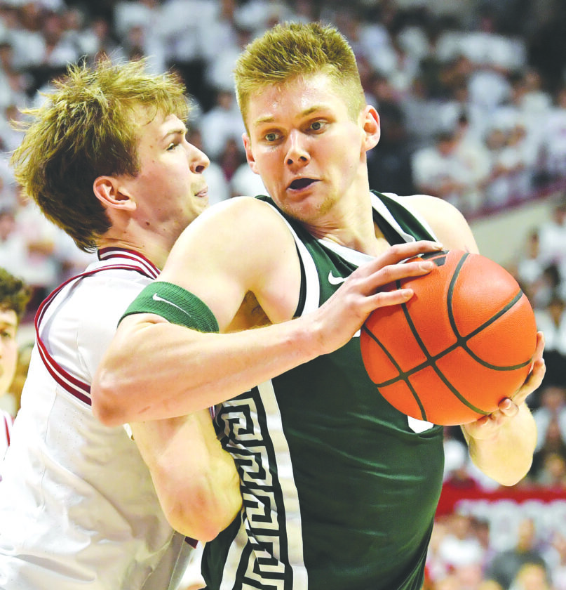 Michigan State forward Jaxon Kohler, right, attempts to get past Indiana forward Reed Bailey during the first half in Bloomington, Ind., on Sunday. (AP photo)