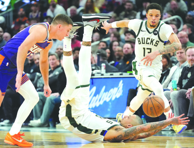 The Bucks' Kyle Kuzma, middle, loses control of the ball between teammate Ryan Rollins, right, and the Phoenix Suns' Collin Gillespie during the second half on Tuesday in Milwaukee. (AP photo)