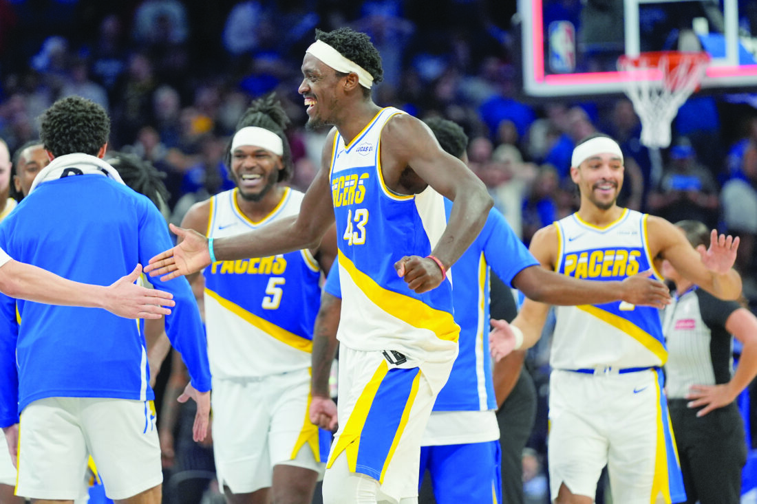 Indiana Pacers forward Pascal Siakam (43) celebrates with teammates including forward Jarace Walker (5) and guard Andrew Nembhard, right, after defeating the Orlando Magic in an NBA basketball game on Monday in Orlando, Fla. (AP photo)