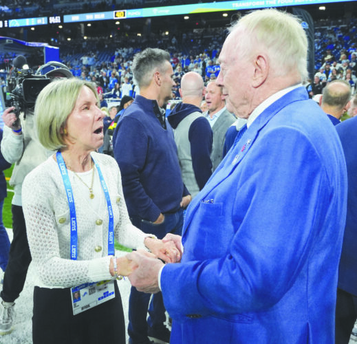 Sheila Ford Hamp, left, principal owner and chair of the Lions, talks with Dallas Cowboys owner Jerry Jones prior to a game on Dec. 4 in Detroit. (AP file photo)